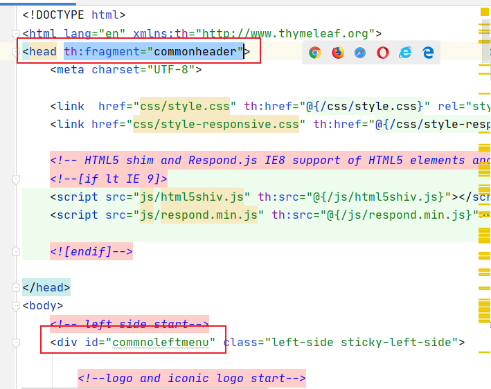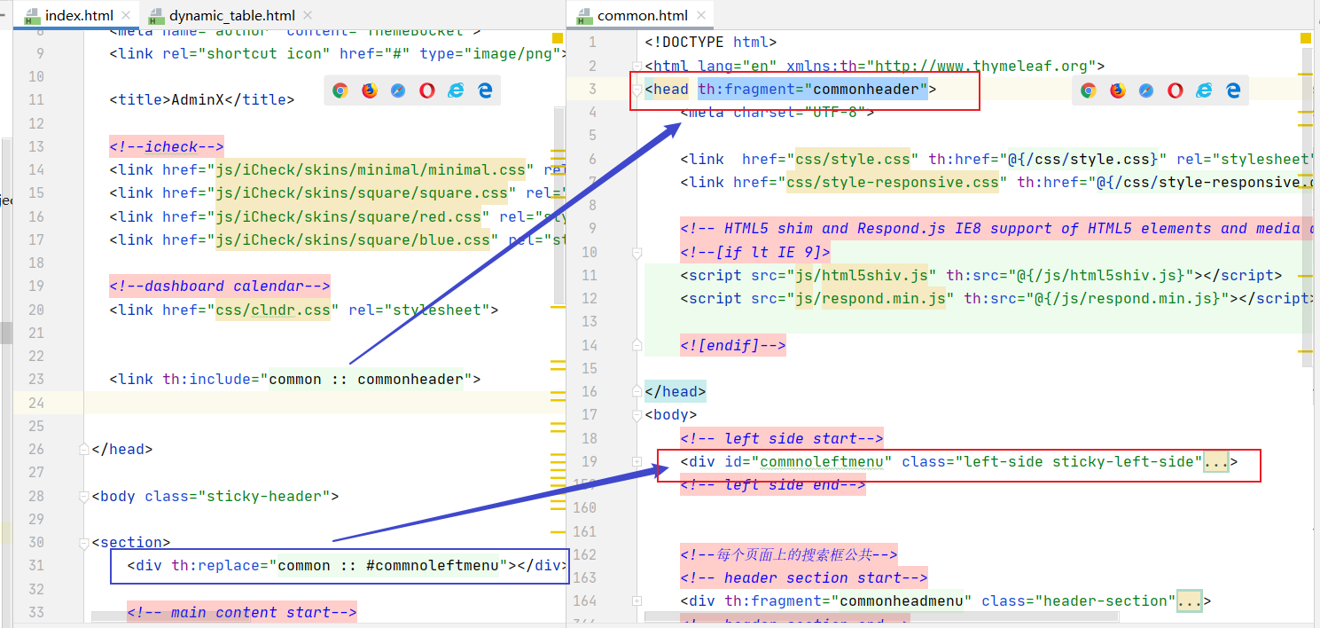 并在公共部分 使用 th:fragment="commonheader" 或者用id选择器 将公共部分声明