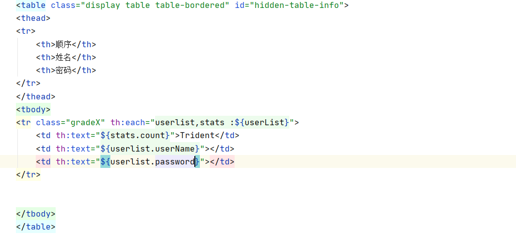 遍历使用 th:each="自定义参数:${列表名字}" 这个例子里面的stats是Thymeleaf的公共部分,表示遍历列表的状态