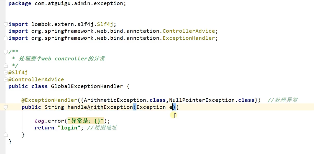 使得发生某些特定异常时,实现视图跳转 下图中的异常就是发生数学异常或者空指针异常时候,实现页面跳转到login页面