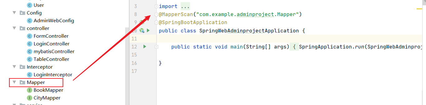 2. Spring Boot 启动类中添加 @MapperScan 注解,扫描 Mapper 文件夹: