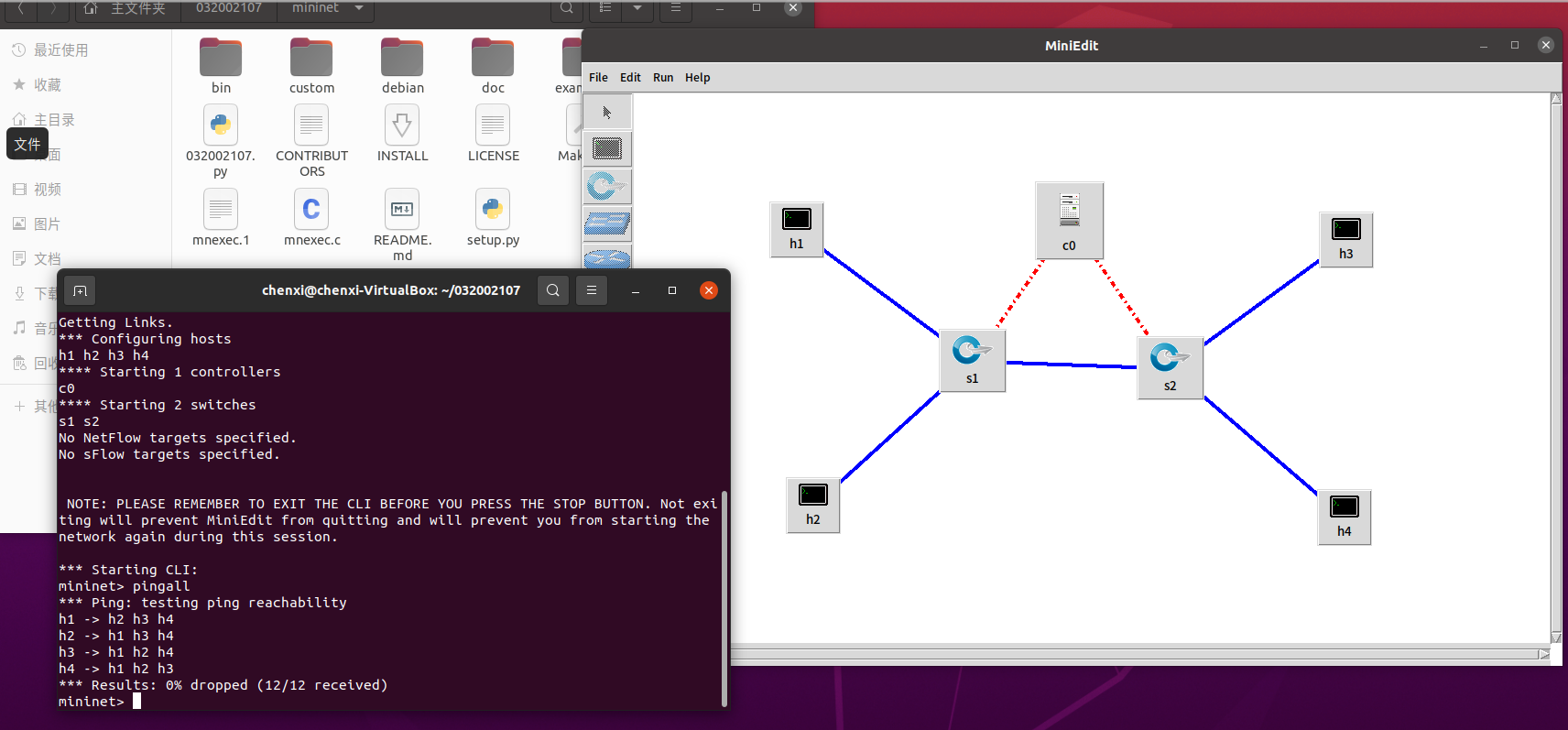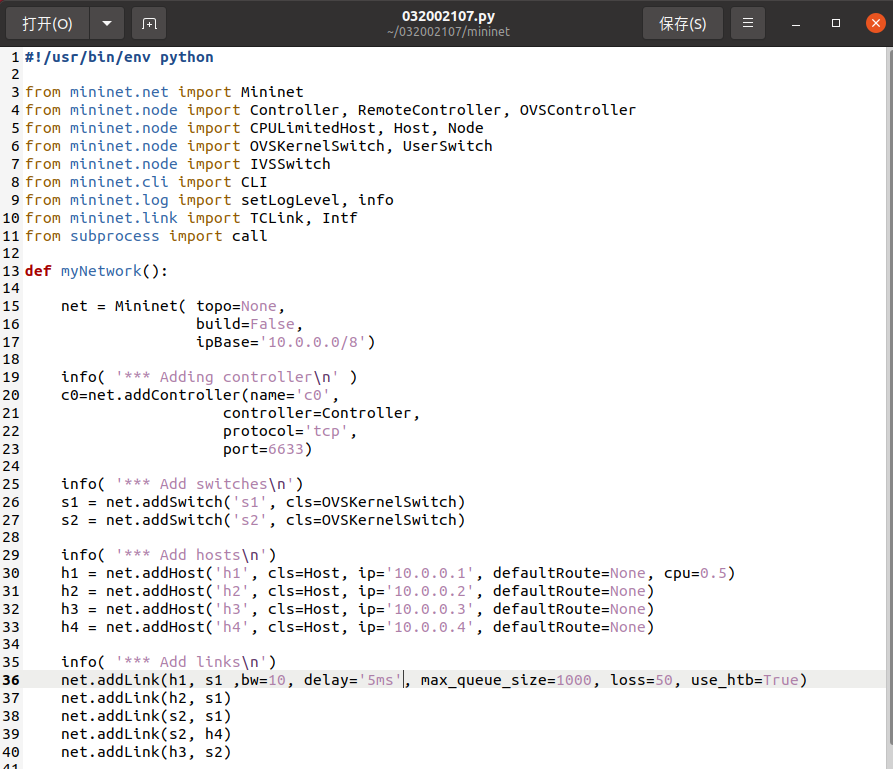 1.使用Mininet可视化工具,生成下图所示的拓扑,并保存拓扑文件名为学号.py。