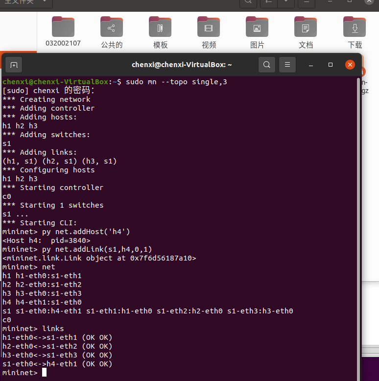 3.在2 b)的基础上,在Mininet交互界面上新增1台主机并且连接到交换机上,再测试新拓扑的连通性。