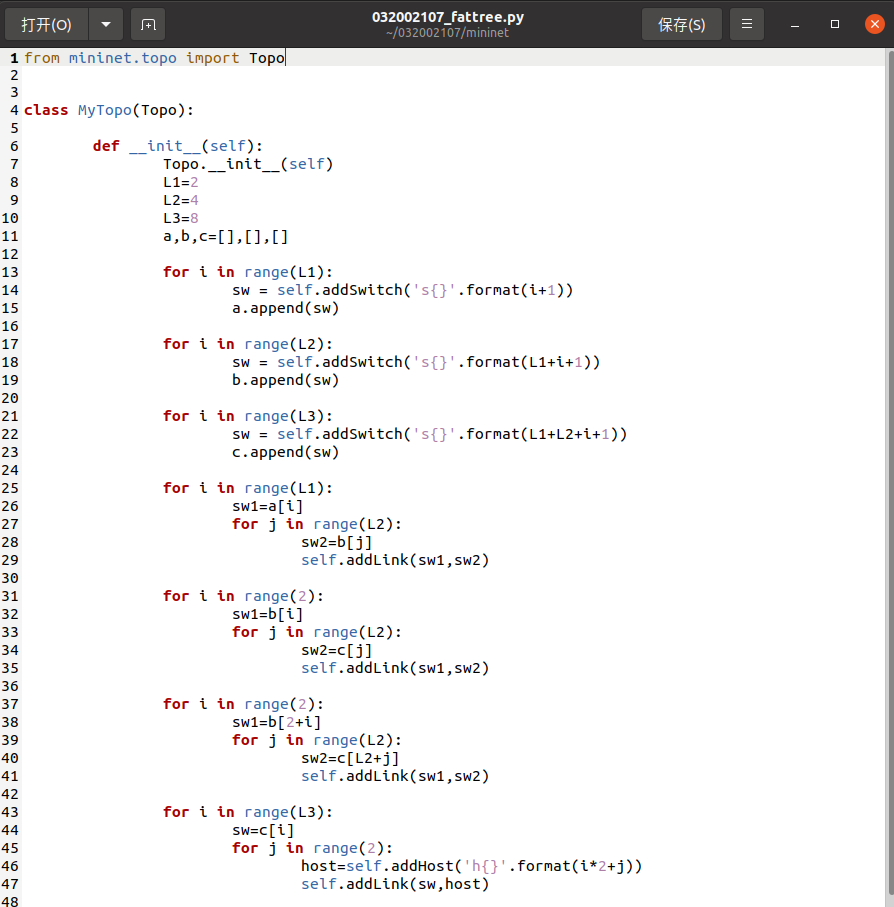 编写.py拓扑文件,命名为“学号_fattree.py”;