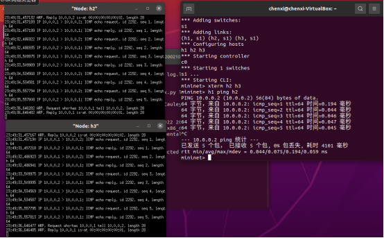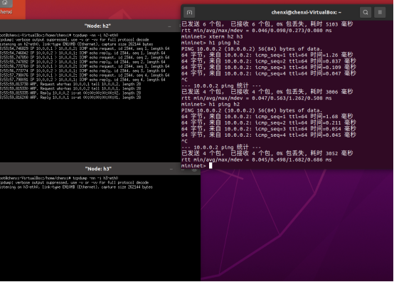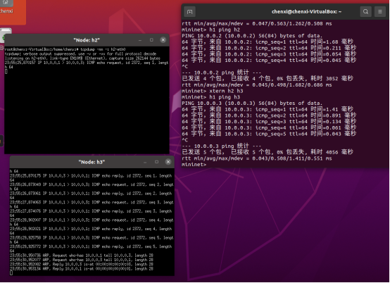 h1 ping h2、h2和h3的tcpdump抓包结果截图如下