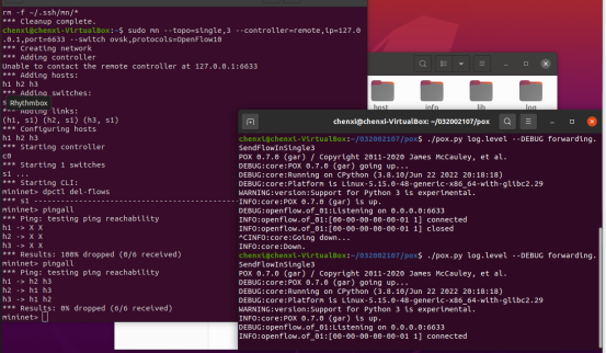 重新搭建(一)的拓扑,此时交换机内无流表规则,拓扑内主机互不相通;编写Python程序自定义一个POX模块SendFlowInSingle3,并且将拓扑连接至SendFlowInSingle3(默认端口6633),实现向s1发送流表规则使得所有主机两两互通。
