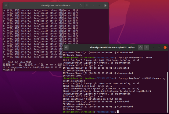 本次实验难度较前两次实验有所提升。在基本要求中,我在了解了tcpdump的使用方法后顺利地进行了实验,对Hub和Switch模块的验证过程是很顺利的。但在进阶要求的第二项中,我发现清除流表后重新生成拓扑怎么也ping不通,通过搜索引擎查询以后得知此现象属正常。在运行SendPoxHardTimeOut代码后,h1 ping h3数据包的收发中断,若不及时重新运行SendFlowInSingle3,则会因为超时太久报错。