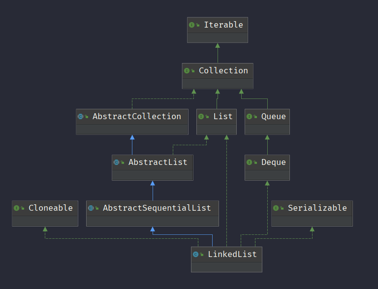 首先先直观的看一下LinedList的继承体系和实现的接口