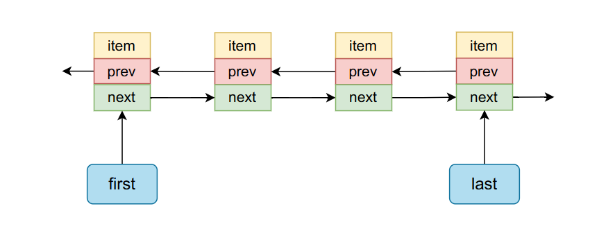 链表当中有first和last字段主要指向链表当中第一个节点和最后一个节点,如果链表当中没有节点,那么他们都是null,如果链表当中有一个节点他们指向同一个节点,如果链表中节点个数大于2,他们分别指向第一个节点和最后一个节点。