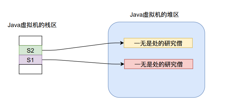 其中 == 比较的是两个对象的内存地址(也就是s1和s2指向的两个对象)是否相同,也就是s1和s2是否是同一个对象,equals比较的是两个字符串对象的内容是否相同(不同的类实现方式不一样可能有差异,字符串String实现方式是只要内容相同equlas方法就返回true,否则返回false),上述代码在内存当中的布局大致如下: