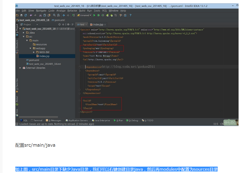 其次pom要有<build> <finalName>test</finalName> </build> 这个关系到上图中的output directory中的配置,finalName作为target下的项目目录,以及会创建对应名字的war包(比如test.war)