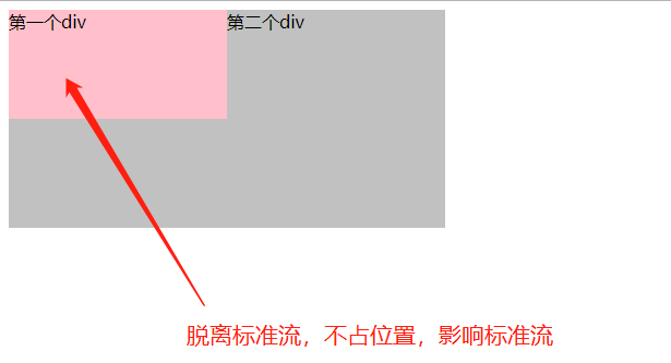 1 <!DOCTYPE html> 2 <html lang="en"> 3 <head> 4 <meta charset="UTF-8"> 5 <meta name="viewport" content="width=device-width, initial-scale=1.0"> 6 <title>Document</title> 7 <style> 8 .box1{ 9 float: left; 10 height: 100px; 11 width: 200px; 12 background-color:pink; 13 } 14 .box2{ 15 height: 200px; 16 width: 400px; 17 background-color: #c1c1c1; 18 } 19 20 </style> 21 </head> 22 <body> 23 <div class="box1">第一个div</div> 24 <div class="box2">第二个div</div> 25 </body> 26 </html>