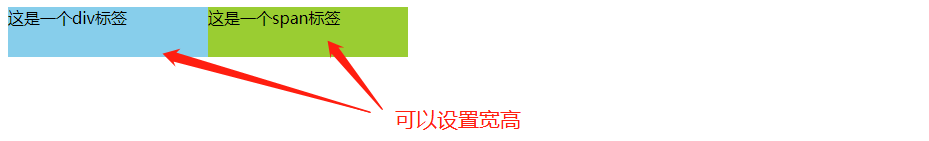 1 <!DOCTYPE html PUBLIC "-//W3C//DTD XHTML 1.0 Transitional//EN" "http://www.w3.org/TR/xhtml1/DTD/xhtml1-transitional.dtd"> 2 <html xmlns="http://www.w3.org/1999/xhtml" xml:lang="en"> 3 <head> 4 <meta http-equiv="Content-Type" content="text/html;charset=UTF-8"> 5 <title>Document</title> 6 <style> 7 div{ 8 float: left; 9 width: 200px; 10 height: 50px; 11 background: skyblue; 12 } 13 span{ 14 float: left; 15 width: 200px; 16 height: 50px; 17 background: yellowgreen; 18 } 19 </style> 20 </head> 21 <body> 22 <div>这是一个div标签</div> 23 <span>这是一个span标签</span> 24 </body> 25 </html>