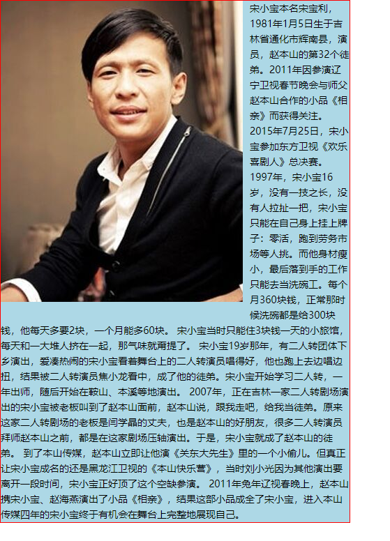 1 <!DOCTYPE html PUBLIC "-//W3C//DTD XHTML 1.0 Transitional//EN" "http://www.w3.org/TR/xhtml1/DTD/xhtml1-transitional.dtd"> 2 <html xmlns="http://www.w3.org/1999/xhtml" xml:lang="en"> 3 <head> 4 <meta http-equiv="Content-Type" content="text/html;charset=UTF-8"> 5 <title>Document</title> 6 <style> 7 *{ 8 margin: 0; 9 padding: 0; 10 } 11 ul,ol{ 12 list-style: none; 13 } 14 .box{ 15 width: 500px; 16 border: 1px solid red; 17 } 18 .box1{ 19 float: left; 20 margin: 0 10px 10px 0; 21 } 22 .box2{ 23 font-size: 14px; 24 line-height: 22px; 25 background: lightblue; 26 } 27 </style> 28 </head> 29 <body> 30 <div class="box"> 31 <div class="box1"> 32 <img src="img/sxb.png" alt="" /> 33 </div> 34 <div class="box2">宋小宝本名宋宝利,1981年1月5日生于吉林省通化市辉南县,演员,赵本山的第32个徒弟。2011年因参演辽宁卫视春节晚会与师父赵本山合作的小品《相亲》而获得关注。 35 2015年7月25日,宋小宝参加东方卫视《欢乐喜剧人》总决赛。 36 1997年,宋小宝16岁,没有一技之长,没有人拉扯一把,宋小宝只能在自己身上挂上牌子:零活,跑到劳务市场等人挑。而他身材瘦小,最后落到手的工作只能去当洗碗工。每个月360块钱,正常那时候洗碗都是给300块钱,他每天多要2块,一个月能多60块。 宋小宝当时只能住3块钱一天的小旅馆,每天和一大堆人挤在一起,那气味就甭提了。 37 宋小宝19岁那年,有二人转团体下乡演出,爱凑热闹的宋小宝看着舞台上的二人转演员唱得好,他也跑上去边唱边扭,结果被二人转演员焦小龙看中,成了他的徒弟。宋小宝开始学习二人转,一年出师,随后开始在鞍山、本溪等地演出。 38 2007年,正在吉林一家二人转剧场演出的宋小宝被老板叫到了赵本山面前,赵本山说,跟我走吧,给我当徒弟。原来这家二人转剧场的老板是闫学晶的丈夫,也是赵本山的好朋友,很多二人转演员拜师赵本山之前,都是在这家剧场压轴演出。于是,宋小宝就成了赵本山的徒弟。 39 到了本山传媒,赵本山立即让他演《关东大先生》里的一个小偷儿。但真正让宋小宝成名的还是黑龙江卫视的《本山快乐营》,当时刘小光因为其他演出要离开一段时间,宋小宝正好顶了这个空缺参演。 40 2011年兔年辽视春晚上,赵本山携宋小宝、赵海燕演出了小品《相亲》,结果这部小品成全了宋小宝,进入本山传媒四年的宋小宝终于有机会在舞台上完整地展现自己。</p> 41 </div> 42 </body> 43 </html>