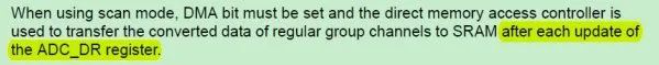 - 只要ADC_DR更新就会进行传递。而ADC_DR会在每个通道转换完后就更新。同时,这里也明确指出,使用扫描模式必须使用DMA。