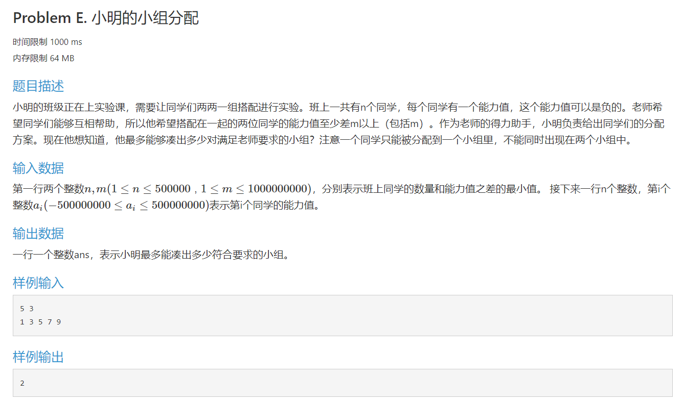 #include<bits/stdc++.h> using namespace std; long long n,m; long long a[500005]; int main() { ios::sync_with_stdio(false); cin.tie(0); cout.tie(0); cin>>n>>m; for(int i=1;i<=n;i++) { cin>>a[i]; } sort(a+1,a+n+1); int l=1; int g=n/2; int r=n/2+1; int ans=0; while(l<=g&&r<=n) { if(a[r]-a[l]>=m) { ++l,++r; ans++; } else ++r; } cout<<ans<<endl; }