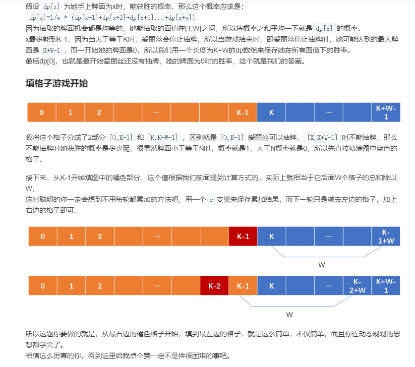 爱丽丝以 0 分开始,并在她的得分少于 K 分时抽取数字。 抽取时,她从 [1, W] 的范围中随机获得一个整数作为分数进行累计,其中 W 是整数。 每次抽取都是独立的,其结果具有相同的概率。