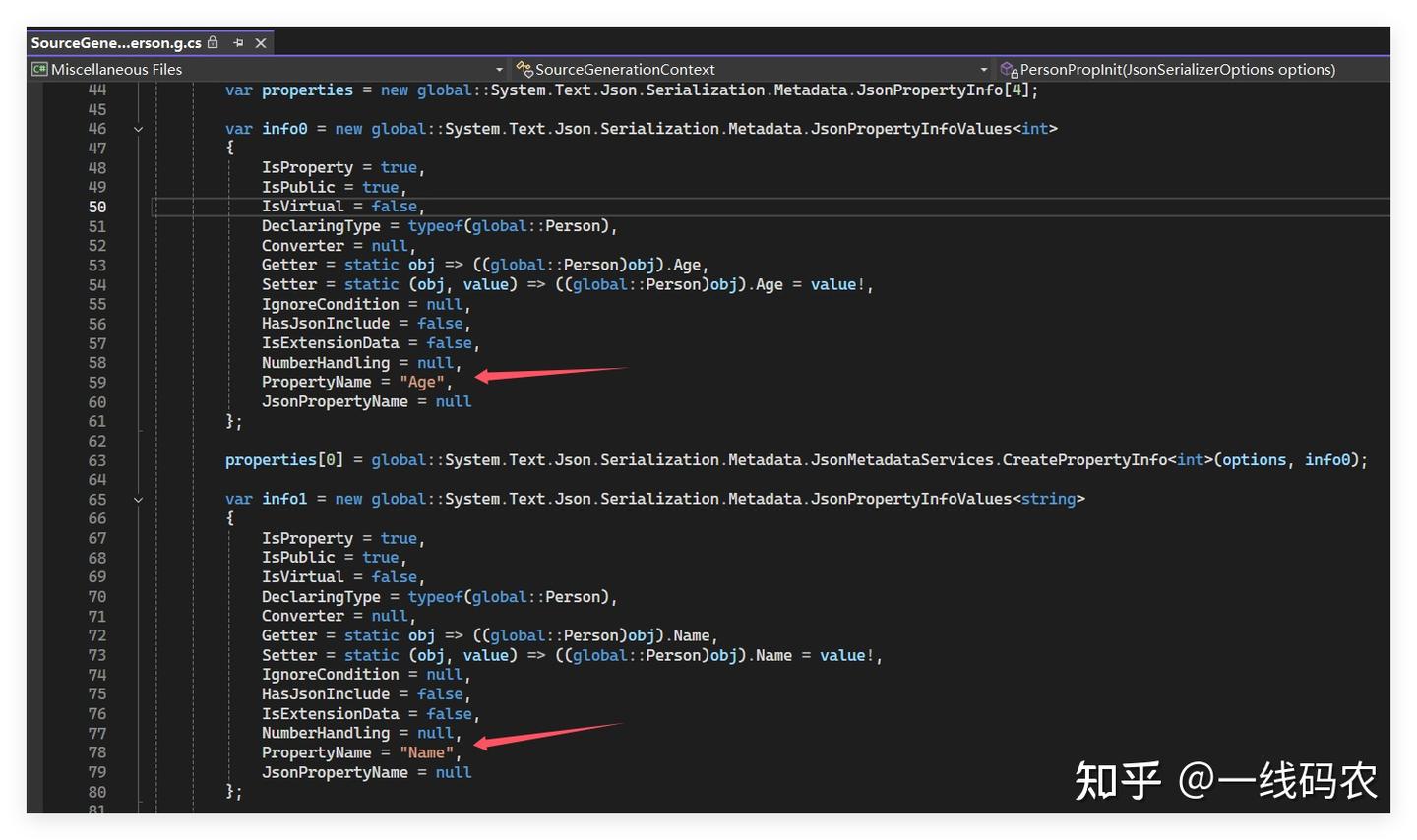 当用 VS 调试的时候,你会发现多了一个 SourceGenerationContext.Person.g.cs 文件,并且用 properties 数组承载了 Person 的元数据,截图如下: