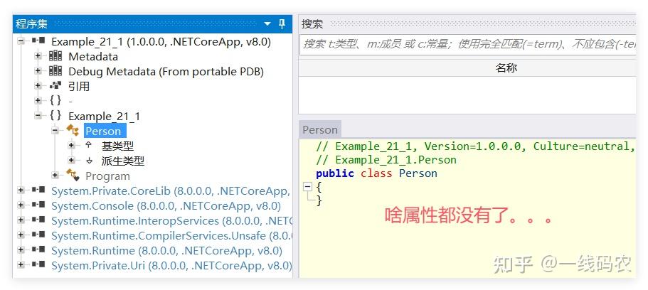 这段代码在 AOT中是提取不出属性的,因为 Invoke(typeof(Person)); 和 type.GetProperties 之间隔了一个 Type type 参数,虽然我们肉眼能知道这个代码的意图,但 ilc 的深度优先它不知道你需要 Person中的什么,所以它只保留了 Person 本身,如果你想直面观测的话,可以这样做: