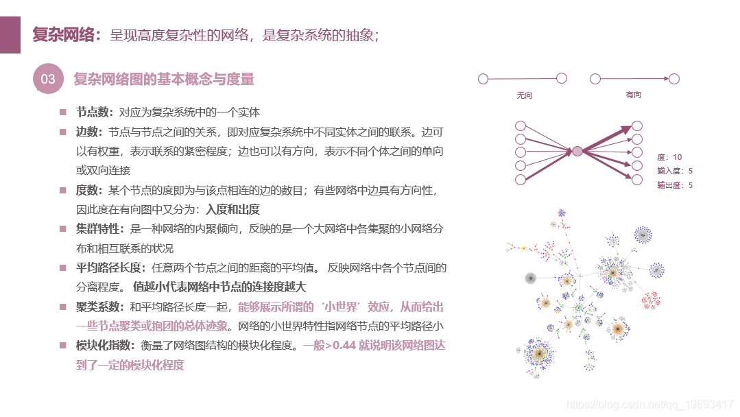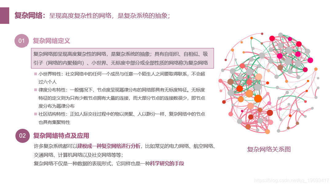 复杂网络即呈现高度复杂性的网络,是复杂系统的抽象;具有自组织、自相似、吸引子(网络的内聚倾向)、小世界、无标度中部分或全部性质的网络称为复杂网络。