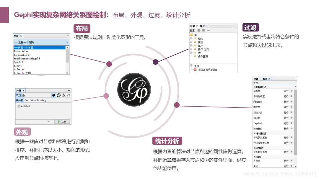 - 外观:根据一些值对节点和标签进行归类和排序,并把排序以大小、颜色的形式应用到节点和标签上。