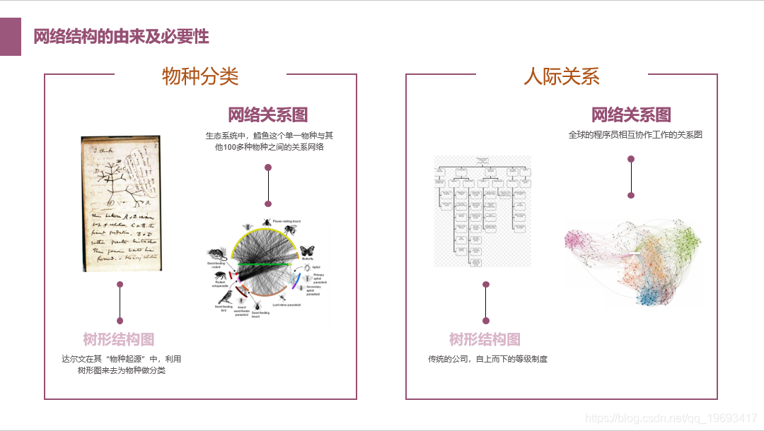 - 物种分类:达尔文在其“物种起源”中,利用树形图来去为物种做分类,后来在生物学中,用网络关系图表达生态系统中的物种关系