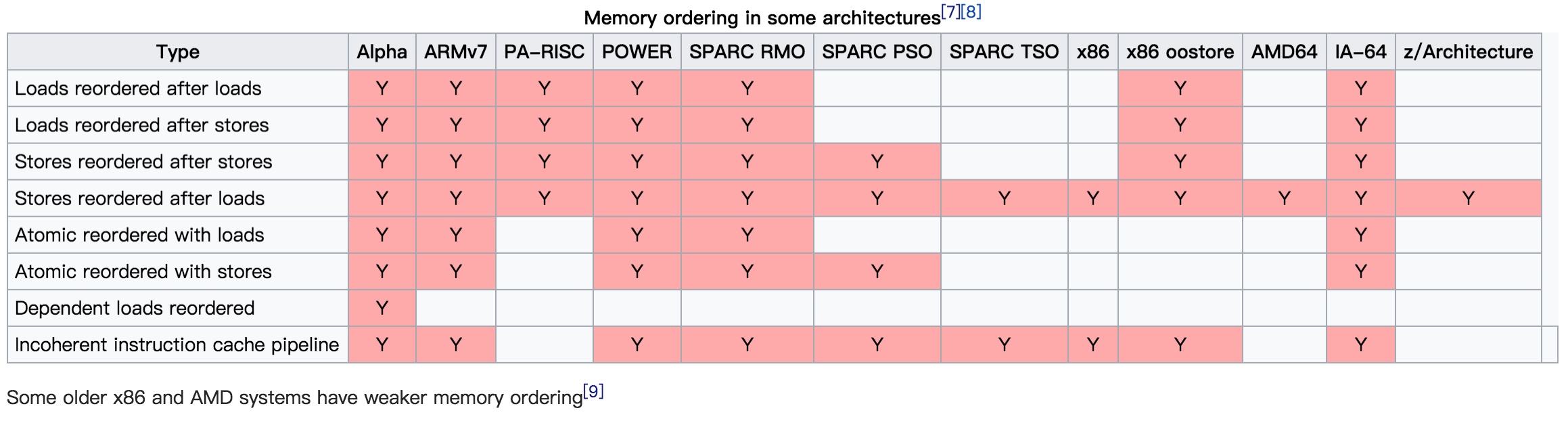 完全的确保顺序一致性需要很大的代价,不仅限制编译器的优化,也限制了CPU的执行效率。为了更好地挖掘硬件的并行能力,现代的CPU多半都是介于两者之间,即所谓的宽松的内存一致性模型(Relaxed Memory Consistency Models)。不同的架构在重排上有各自的尺度,在严格排序和自由排序之间会有各自的偏向。偏向严格排序的一边,称之为强模型(Strong Model),而偏向于自由排序的一边,称之为弱模型(Weak Model)。AMD64架构是強模型: