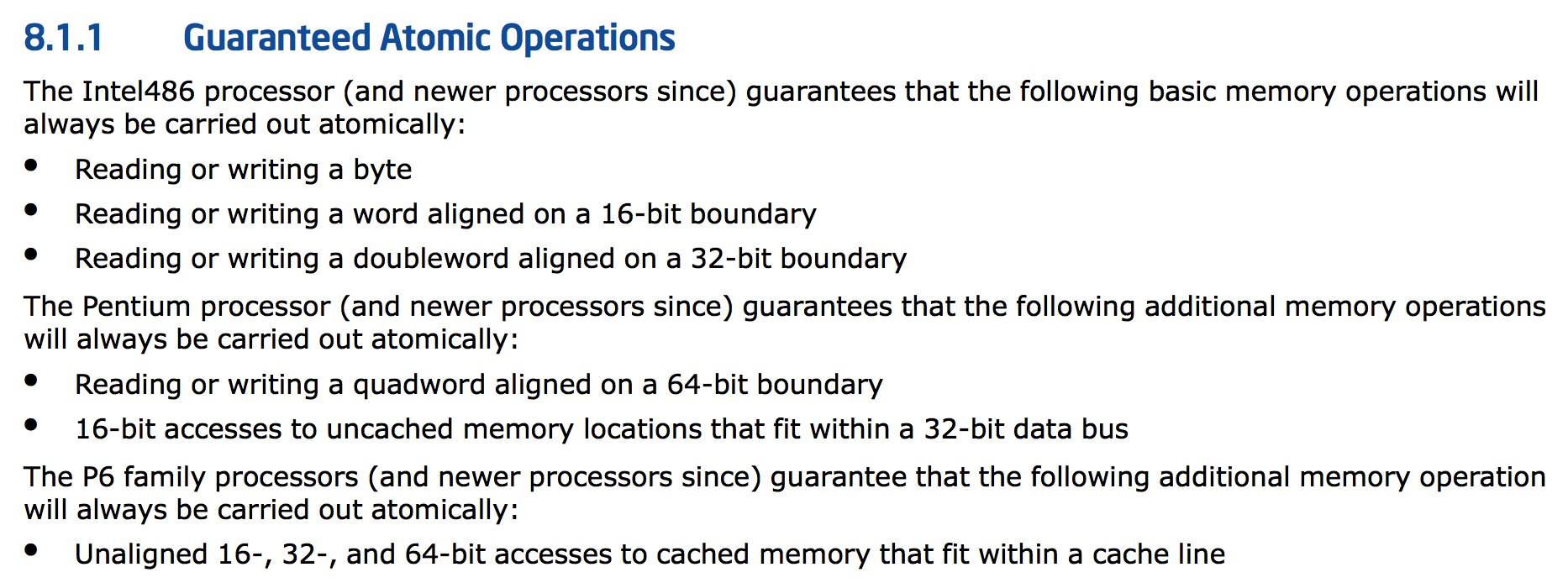 的写操作在满足对齐内存访问的情况下是原子的,不需要额外的同步措施。注意这里我加粗了单核CPU这个关键字,那么到了多核心处理器的今天,该操作就不是原子了吗?不,依旧是原子的,但是出现了其他的干扰因素迫使可能需要额外的同步措施才能保证原本无锁代码的正确运行。