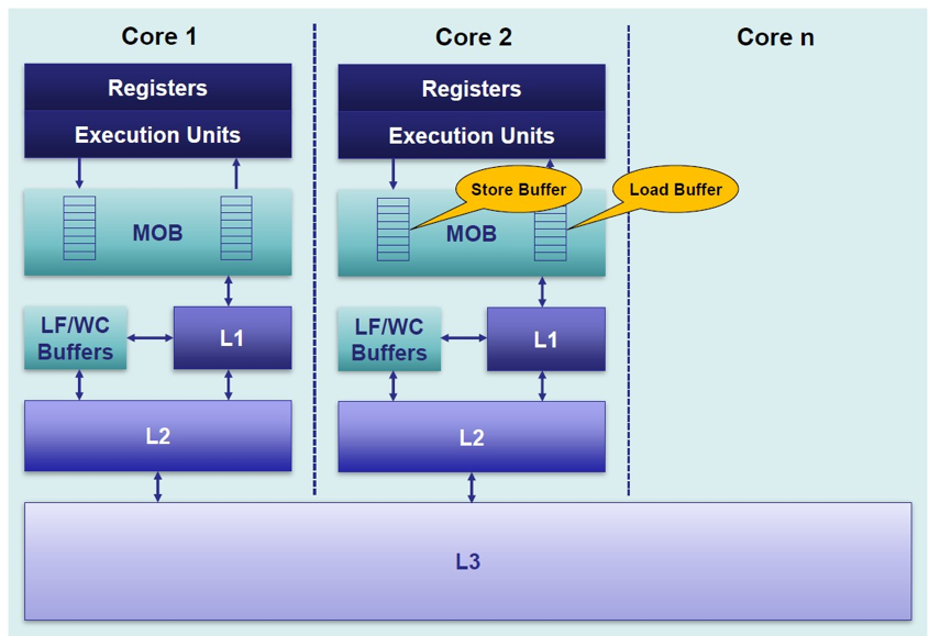 当一个核心在Invalid状态进行写入时,首先会给其它CPU核发送Invalid消息,然后把当前写入的数据写入到Store Buffer中。然后异步在某个时刻真正的写入到Cache Line中。当前CPU核如果要读Cache Line中的数据,需要先扫描Store Buffer之后再读取Cache Line(Store-Buffer Forwarding)。但是此时其它CPU核是看不到当前核的Store Buffer中的数据的,要等到Store Buffer中的数据被刷到了Cache Line之后才会触发失效操作。而当一个CPU核收到Invalid消息时,会把消息写入自身的Invalidate Queue中,随后异步将其设为Invalid状态。和Store Buffer不同的是,当前CPU核心使用Cache时并不扫描Invalidate Queue部分,所以可能会有极短时间的脏读问题。当然这里的Store Buffer和Invalidate Queue的说法是针对一般的SMP架构来说的,不涉及具体架构。事实上除了Store Buffer和Load Buffer,流水线为了实现并行处理,还有Line Fill Buffer/Write Combining Buffer 等组件,参考文献8-10给出了相关的资料可以进一步阅读。