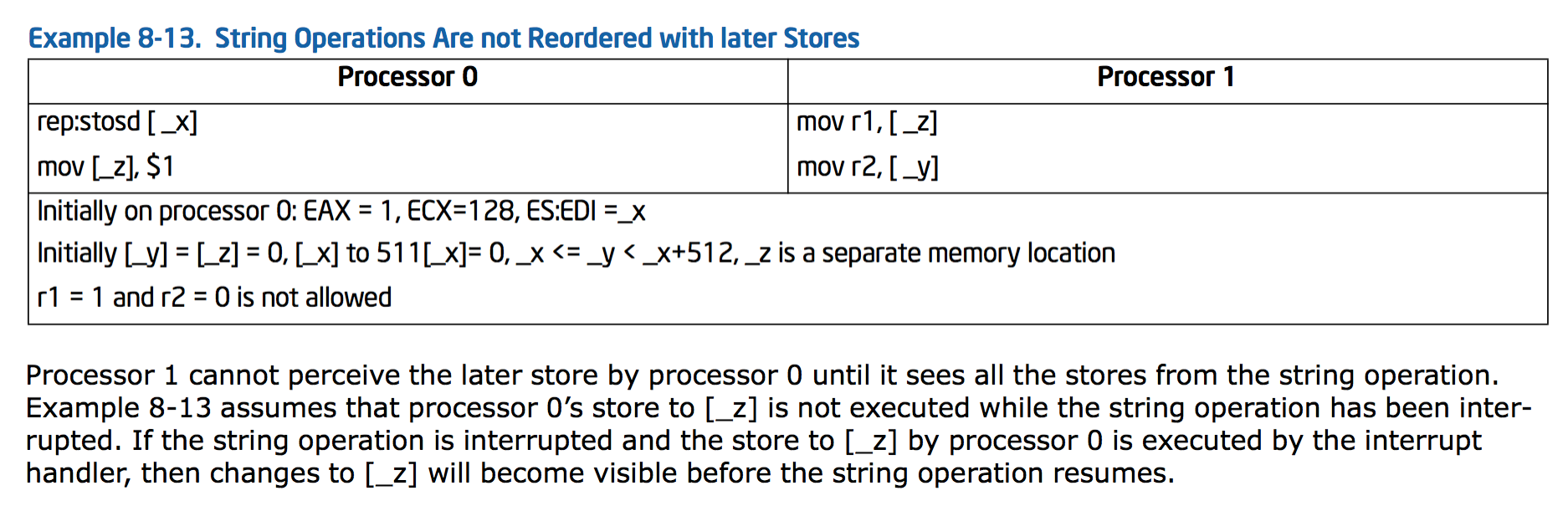 至于串操作,对buffer的修改可能是memcpy之类的操作,而对index的操作是普通赋值。memcpy在某些库中的实现使用了串操作指令又会怎样?会导致Store操作乱序吗?Intel有如下的说明: