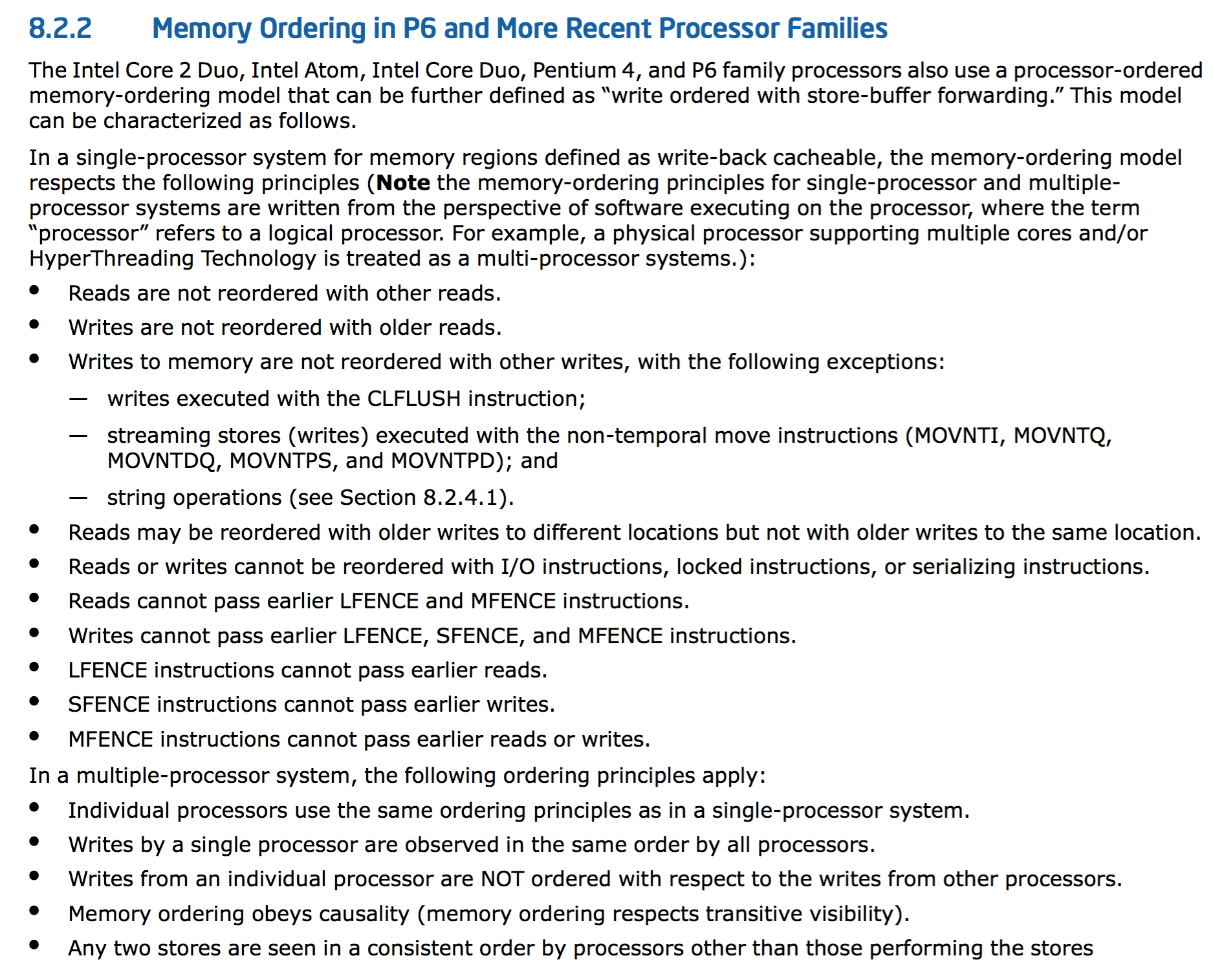 - 写不能越过较早的读屏障指令(LFENCE)、写屏障指令(SFENCE)和全屏障指令(MFENCE)