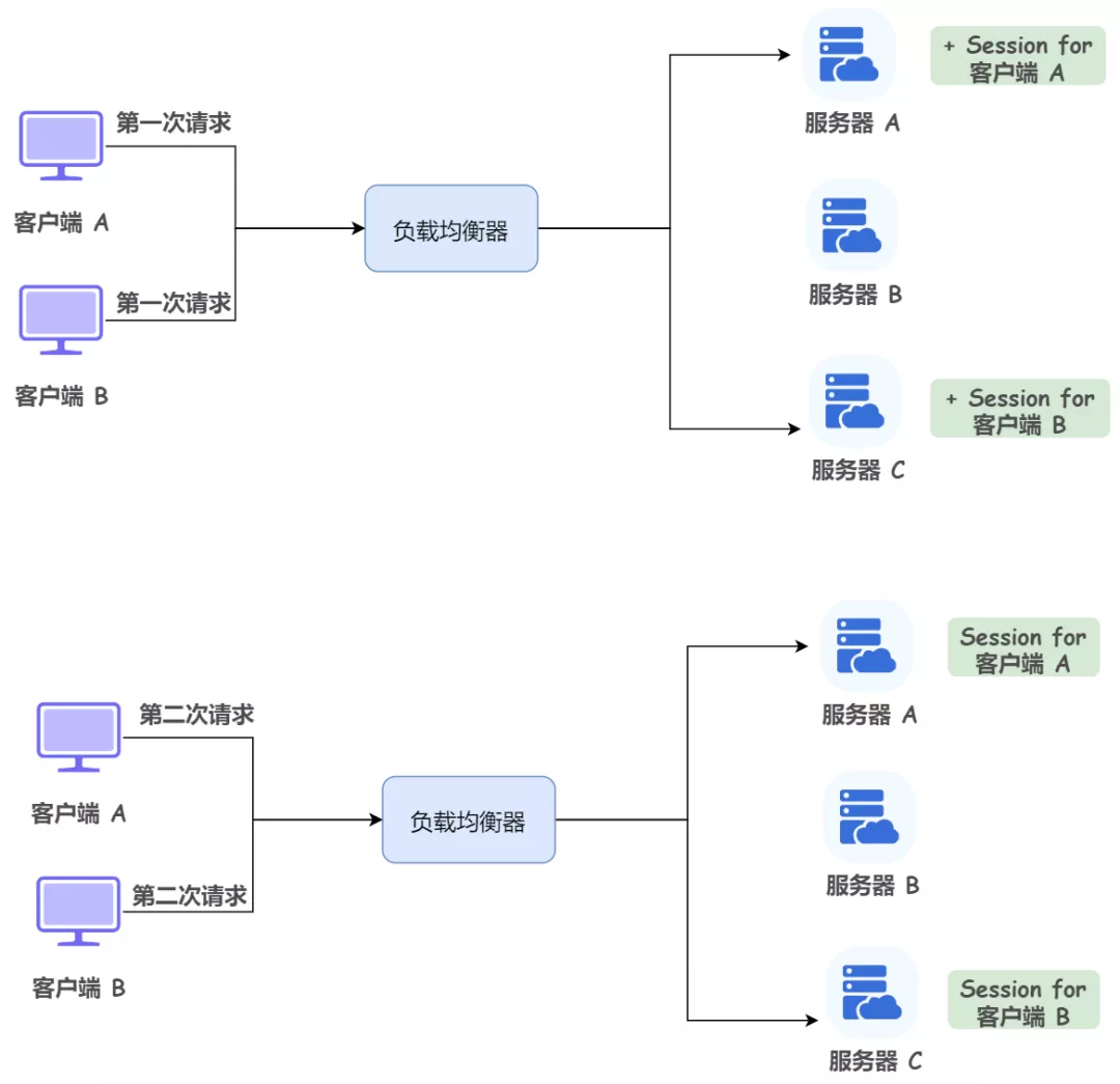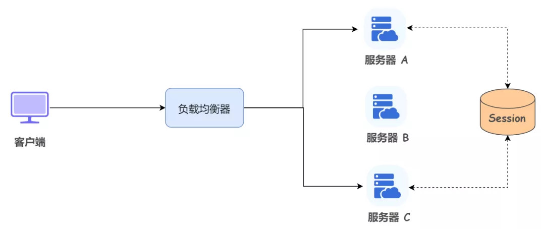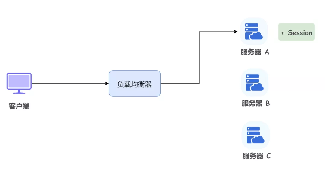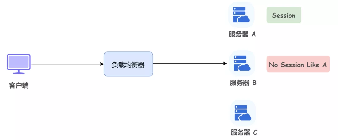 举个例子,比如我们有多个服务器,客户端 1 向服务器发送了一个请求,由于负载均衡的存在,该请求被转发给了服务器 A,于是服务器 A 创建并存储了这个 Session