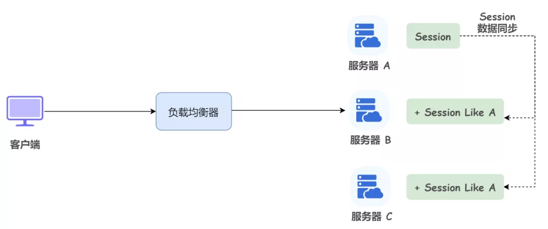这个是最容易想到的,既然服务器 B 没有服务器 A 存储的 Session,那各个服务器之间同步一下 Session 数据不就完了。