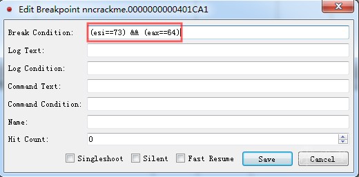 在Break Condition写入中断条件,如下图中写的:(esi == 73) && (eax==64)