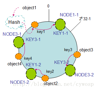 通过上图可以看出对象与机器处于同一哈希空间中,这样按顺时针转动object1存储到了NODE1中,object3存储到了NODE2中,object2、object4存储到了NODE3中。在这样的部署环境中,hash环是不会变更的,因此,通过算出对象的hash值就能快速的定位到对应的机器中,这样就能找到对象真正的存储位置了。