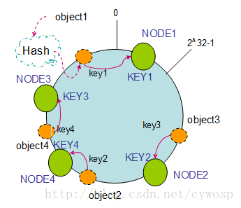 通过按顺时针迁移的规则,那么object2被迁移到了NODE4中,其它对象还保持这原有的存储位置。通过对节点的添加和删除的分析,一致性哈希算法在保持了单调性的同时,还是数据的迁移达到了最小,这样的算法对分布式集群来说是非常合适的,避免了大量数据迁移,减小了服务器的的压力。