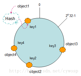 按照常用的hash算法来将对应的key哈希到一个具有2^32次方个桶的空间中,即0~(2^32)-1的数字空间中。现在我们可以将这些数字头尾相连,想象成一个闭合的环形。如下图