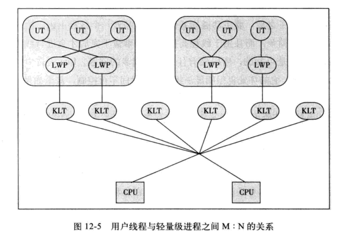 用户线程完全建立在用户空间中,因此用户线程的创建、切换、析构依然廉价,支持大规模的用户线程并发。而轻量级进程则作为用户线程和内核线程的桥梁,这样可以使用内核提供的线程调度功能及处理器映射,并且用户线程的系统调用通过轻量级进程完全,降低了进程被阻塞的风险。这种混合模式下,用户线程和轻量级进程的数量比不确定,一般称为多对多线程模型,如下图所示: