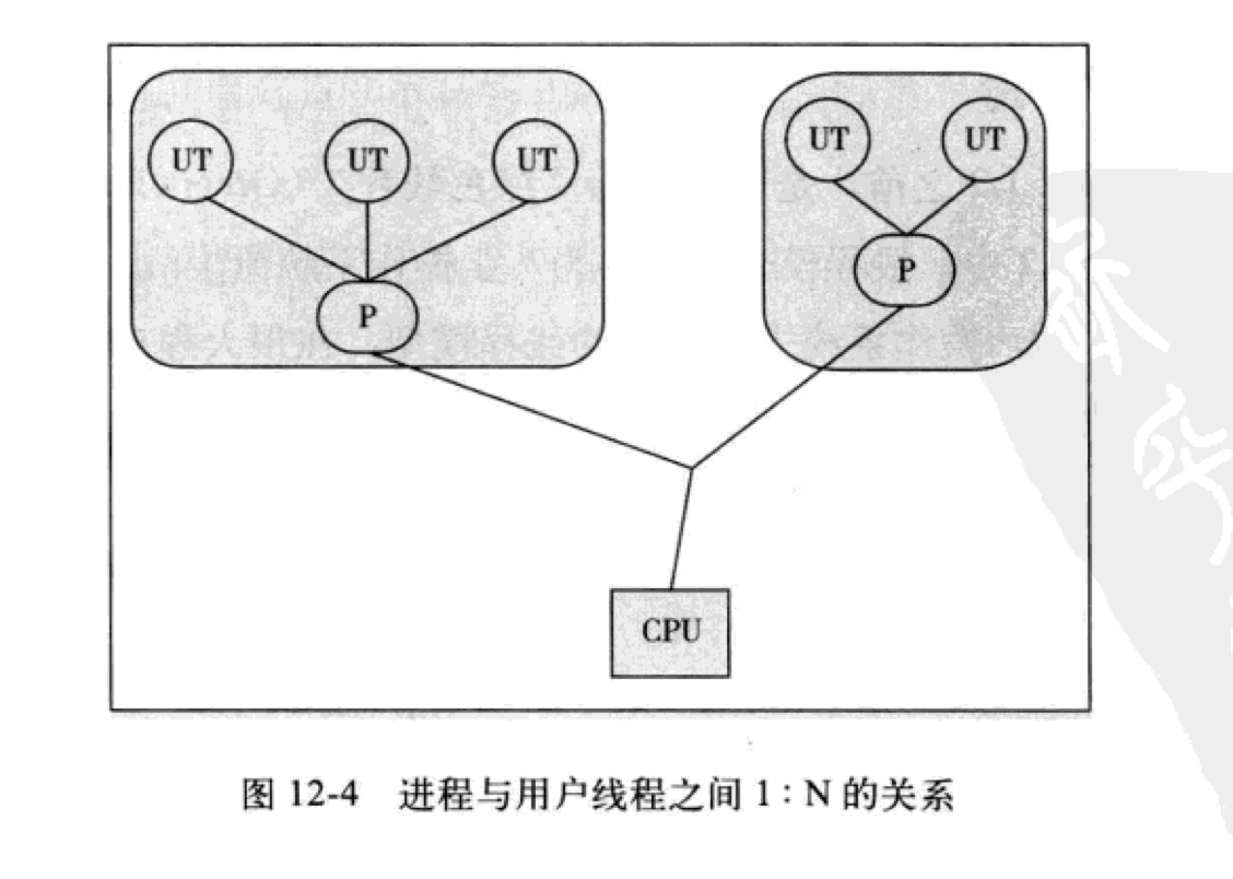 广义上说,不是内核线程,就可以被认为是用户线程。从这个定义看,轻量级进程(LWP)也属于用户进程。而狭义的用户线程是指完全建立在用户空间的线程库上,系统内核是无法感知到线程的存在的。用户线程的创立、同步、销毁、调度完全在用户态完成,不需要内核的帮助。如果实现的牛逼,这种线程不需要切换到内核态,操作效率非常高,消耗也很低,而且支持大规模的线程数量(比如mysql?),部分高性能数据库中的多线程就是由用户线程实现的。这种进程与用户线程之间1:N的关系被称为一对多的线程模型,如下图所示: