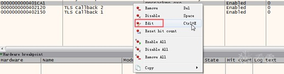 在想要设置断点的指令处按F2设置断点,然后在断点窗口选中该断点,右键选择“Edit”