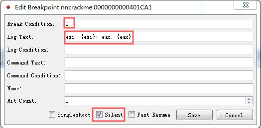 如下图所示,设置break condition为0,Log text设置需要记录的数据,同时将silent项选上。