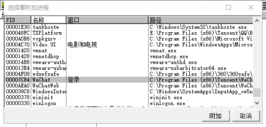 点击文件菜单,选择“附加”,在弹出的对话框中找到名称为WeChat的进程,其窗口名称为“登录”。然后点击“附加”。