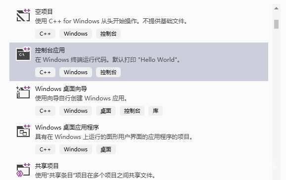 滚动下拉条,在窗口中选择C++控制台应用: