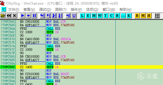 切换到微信登录页面,点击登录,然后到手机端确认登录。这是OllyDbg界面中的数据不断滚动,直到EDX不再为全0并且各个窗口内容停止滚动为止。