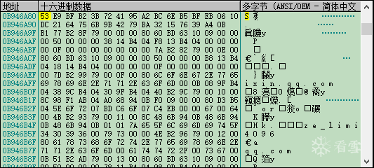 图示中从0B946A80(这个数值是变化的,不但每台电脑不同,每次调试也可能完全不同)到0B946A9F共32个字节就是微信的加密密码,本图中就是: