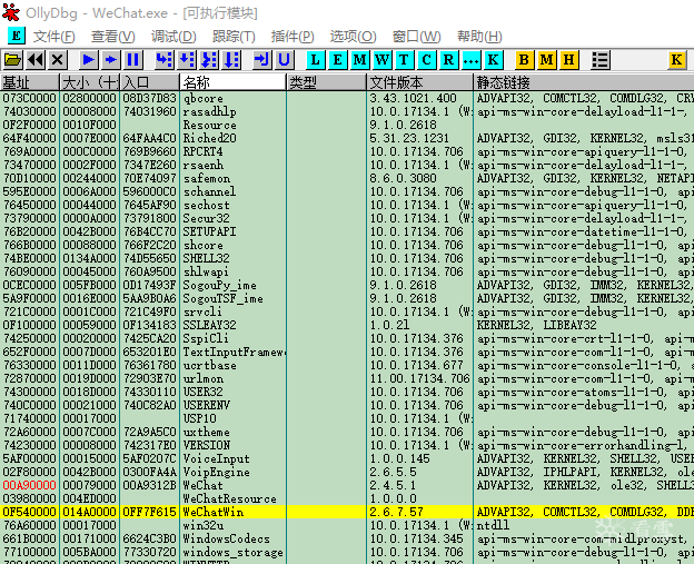 附加成功后OllyDbg开始加载,成功加载后可以看到最上面OllyDbg后面有WeChat.exe的字样: