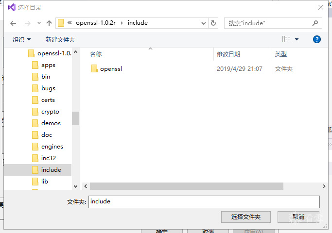 在弹出的对话框里选择刚刚安装的openssl目录(本文是c:\openssl-1.0.2r)中的include目录。