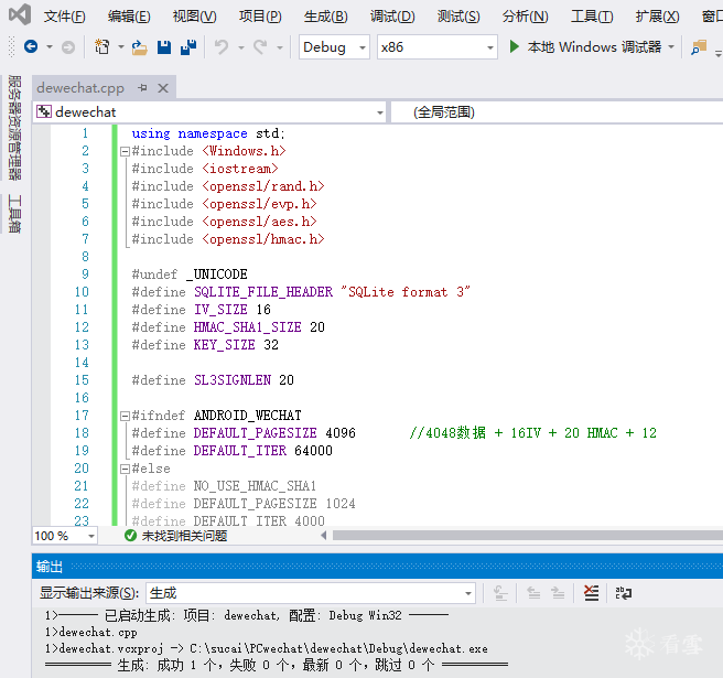 接下来就是解密过程。在看雪、52破解等多个论坛中都有相关的C++源码,开始企图使用Dev-C++或者C-Free等轻量级IDE进行编译,也使用过Visual C++ 6.0绿色精简版,结果多次尝试出现各种错误,反复失败,最终不得已使用Visual Studio,并对代码进行了一定的修正,终于调试成功。