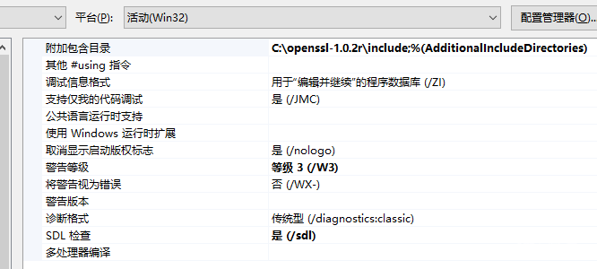 在中间位置,有一个“附加库目录”,点击右侧空白处,选择openssl目录下的lib目录,设置完成后如下:
