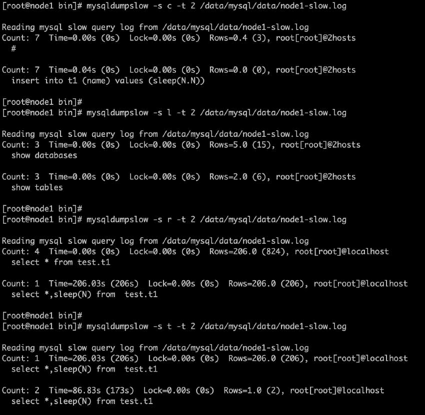 • 使用mysqldumpslow分别对慢查询日志按执行次数、锁定时间、返回行数和执行时间分析排序后输出
