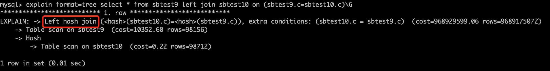 •MySQL8.0.18开始支持Explain analyze,Explain analyze按format=tree格式输出,除了返回预估的成本和返回行数外,还会真正的执行这个SQL并返回实例的执行时间、返回行数和循环次数;因为会真正执行SQL,在8.0.20以后可以通过kill query或 CTRL-C终止运行。hash join用法只能由TREE格式显示,所以Explain analyze也可以显示查询是否使用hash join。
